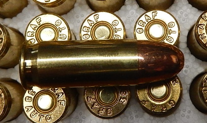 .38 Auto (a.k.a. .38 ACP) 130g FMJ. This ammunition is the predecessor of the .38 Super. It operates at a much lower pressure and is safe for all firearms chambered for the .38 Auto/.38 ACP/.38 Super.