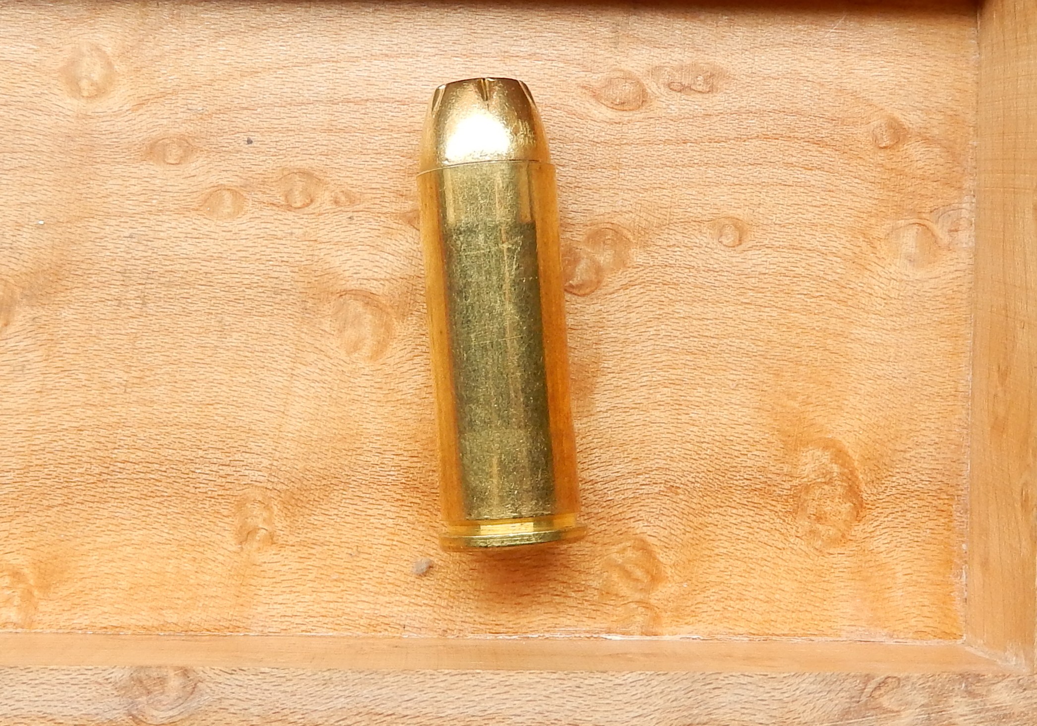 .45 Long colt loaded with the 185g Gold, this load is designed for all revolvers firing the .45LC. Adding a light weight bullet at 1150FPS to the market allows for hunting small game and SD applications without the need to purchase a Ruger or T/C. The Gold bullet uses a brass pre-cut and folded jacket for quick expansion and energy transfer, and its driving band helps hold the jacket and core together for max expansion.