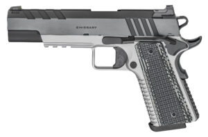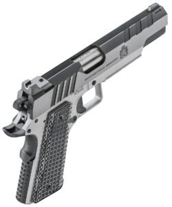 For those who want a pistol that combines cutting-edge defensive features with custom upgrades, the Emissary 5” 9mm is a serious user’s pistol. With a Tri-Top slide featuring light-diffusing 40 line-per-inch serrations along the sighting plane and a heavy-profile forged stainless steel bull barrel, the 9mm Emissary delivers maximum accuracy. A forged hot salt blued slide and forged stainless steel frame with squared triggerguard and grenade-pattern checkering gives you a pistol ready for display or defense.
